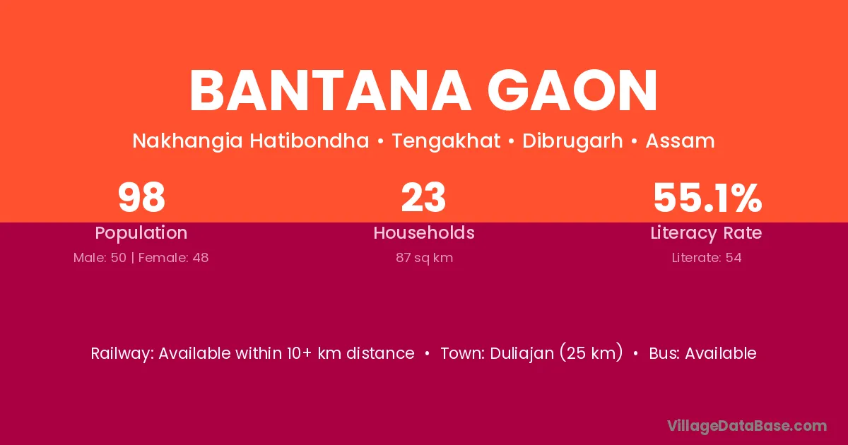 Duliajan (25 km) is the nearest town to Bantana Gaon village for major economic activities and is located approximately 25 km away.