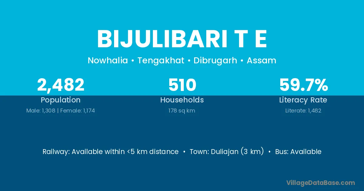 Duliajan (3 km) is the nearest town to Bijulibari T E village for major economic activities and is located approximately 3 km away.