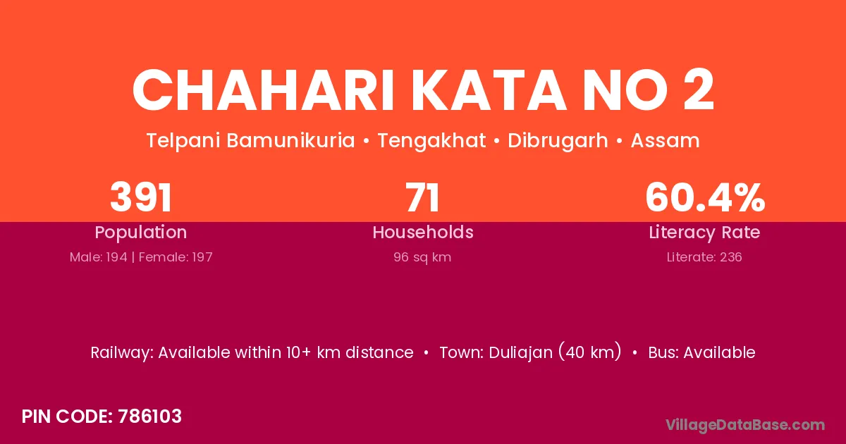 Duliajan (40 km) is the nearest town to Chahari Kata No 2 village for major economic activities and is located approximately 40 km away.