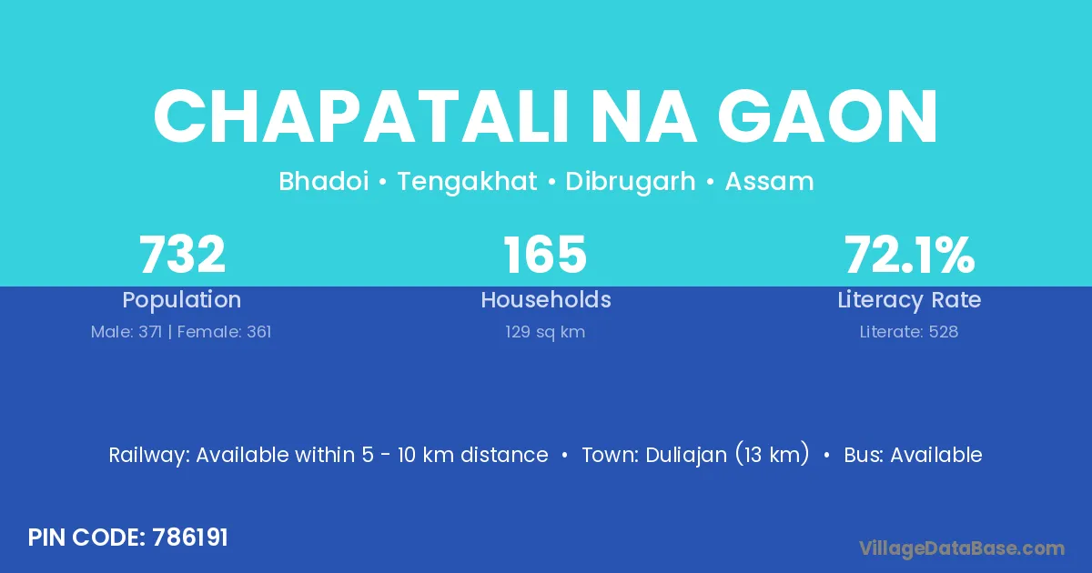 Duliajan (13 km) is the nearest town to Chapatali Na Gaon village for major economic activities and is located approximately 13 km away.