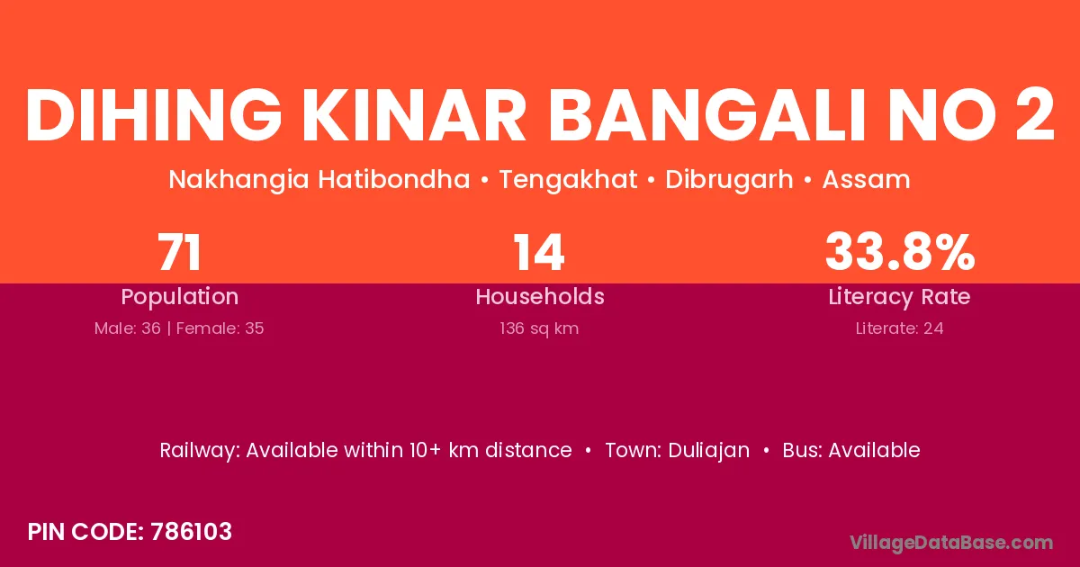 Dihing Kinar Bangali No 2 village has a total population of 71 people, of which 36 are males and 35 are females.