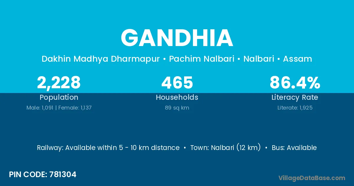 Dibrugarh (27 km) is the nearest town to Gandhia village for major economic activities and is located approximately 27 km away.