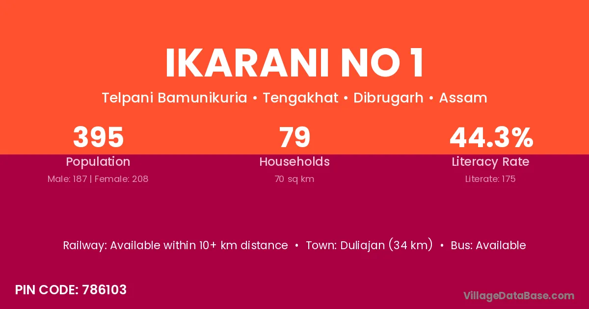 Duliajan (34 km) is the nearest town to Ikarani No 1 village for major economic activities and is located approximately 34 km away.