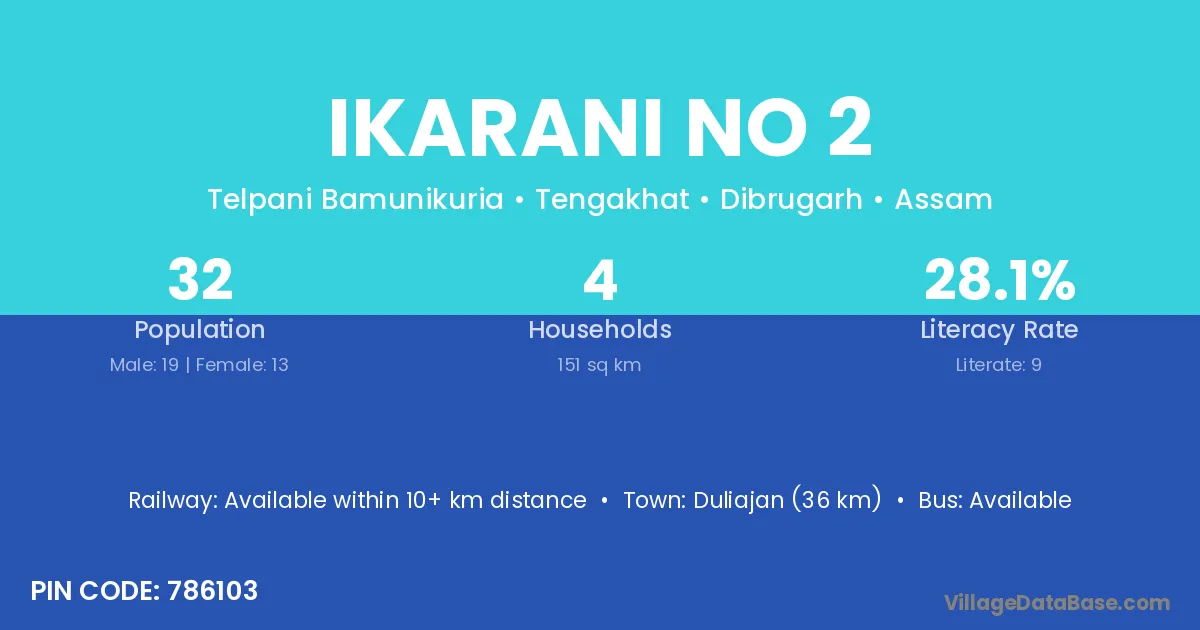 Duliajan (36 km) is the nearest town to Ikarani No 2 village for major economic activities and is located approximately 36 km away.