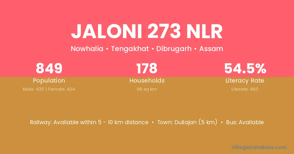 Duliajan (5 km) is the nearest town to Jaloni 273 Nlr village for major economic activities and is located approximately 5 km away.