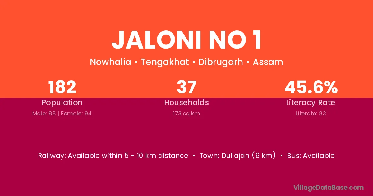 Duliajan (6 km) is the nearest town to Jaloni No 1 village for major economic activities and is located approximately 6 km away.