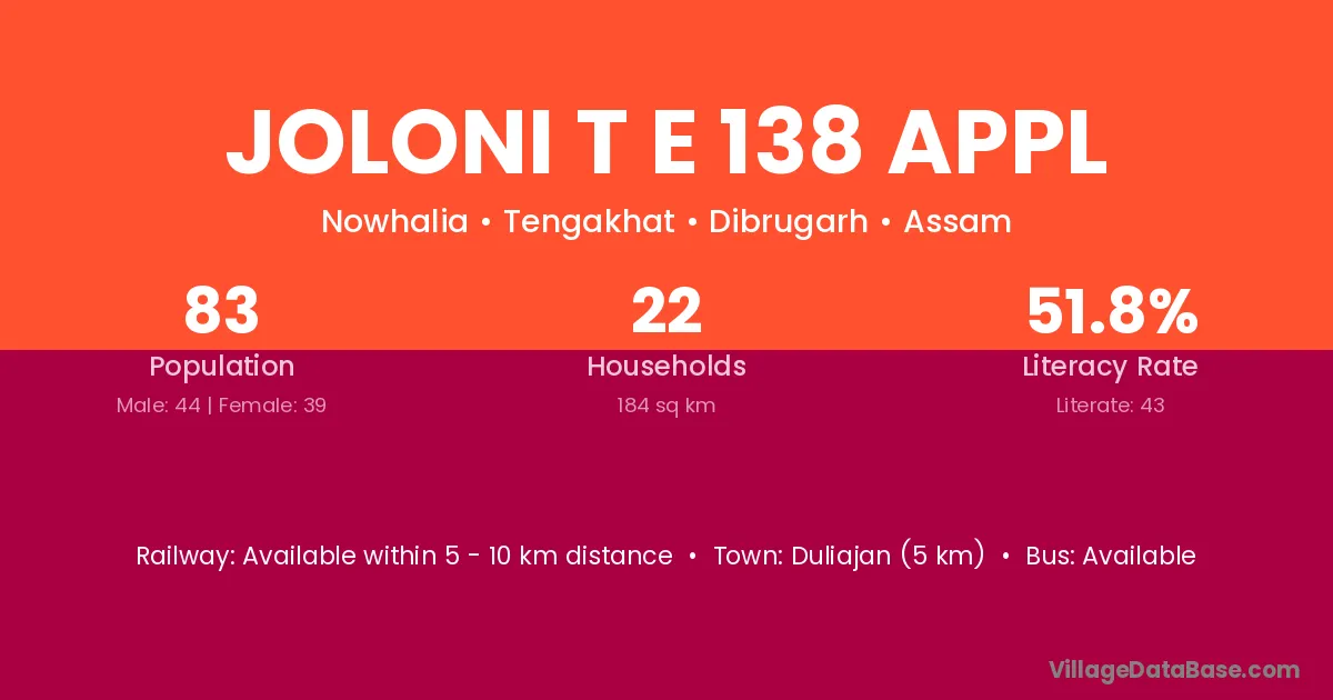 Duliajan (5 km) is the nearest town to Joloni T E 138 Appl village for major economic activities and is located approximately 5 km away.