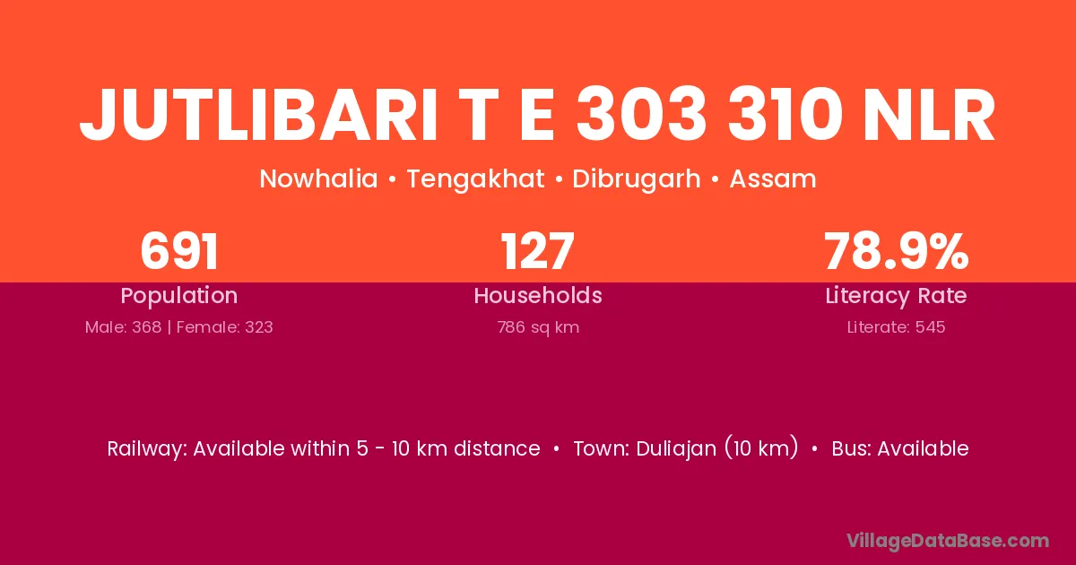 Duliajan (10 km) is the nearest town to Jutlibari T E 303 310 Nlr village for major economic activities and is located approximately 10 km away.