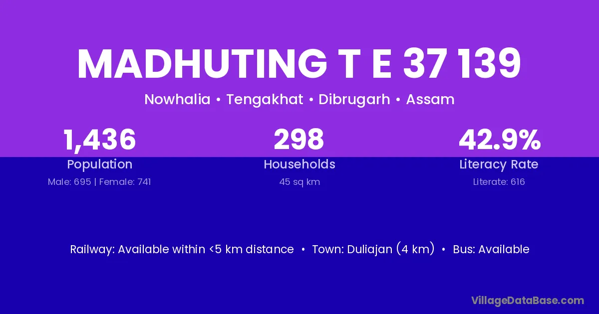 Duliajan (4 km) is the nearest town to Madhuting T E 37 139 village for major economic activities and is located approximately 4 km away.