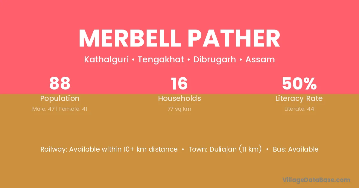 Duliajan (11 km) is the nearest town to Merbell Pather village for major economic activities and is located approximately 11 km away.