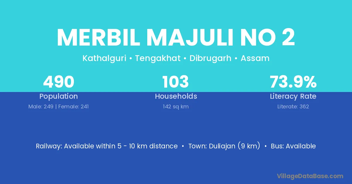Merbil Majuli No 2 village has a total population of 490 people, of which 249 are males and 241 are females.