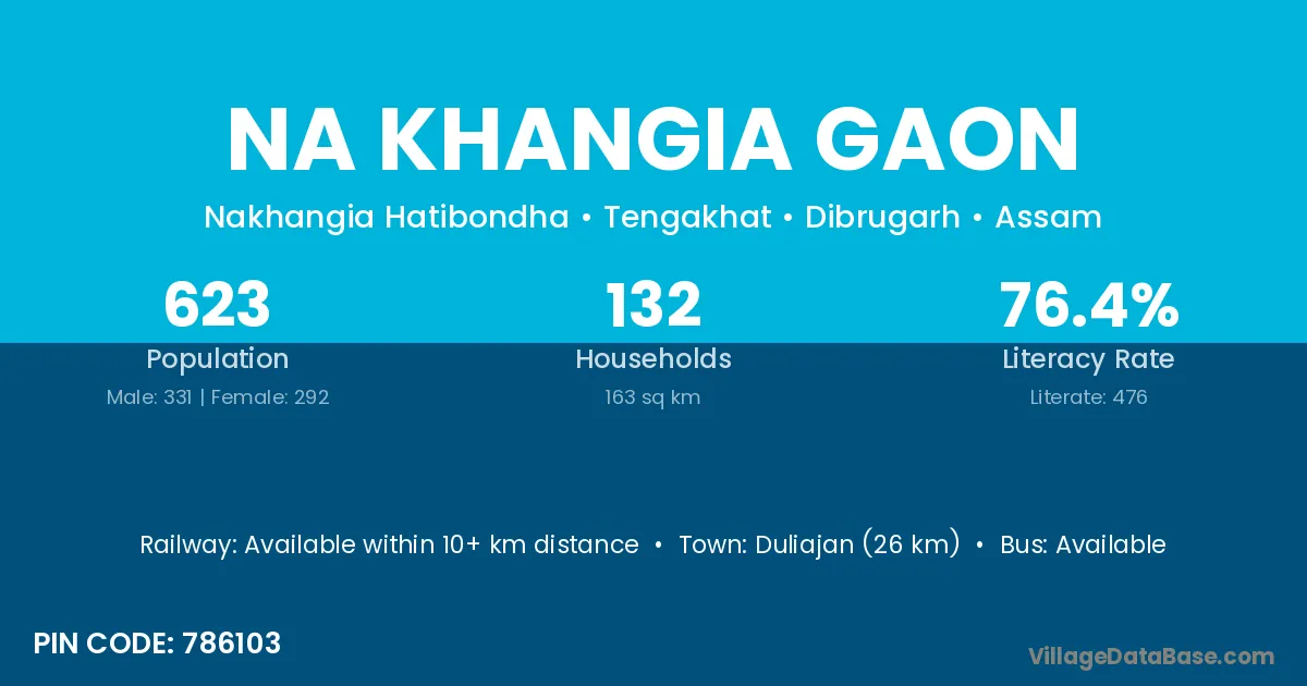 Duliajan (26 km) is the nearest town to Na Khangia Gaon village for major economic activities and is located approximately 26 km away.