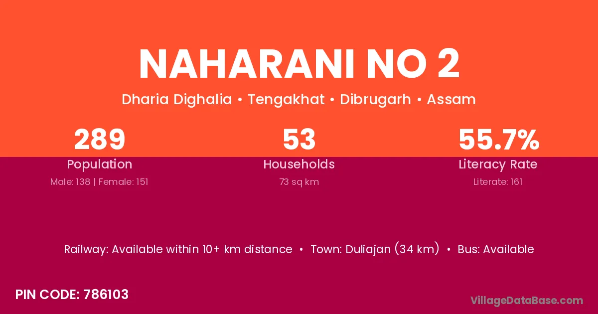 Duliajan (34 km) is the nearest town to Naharani No 2 village for major economic activities and is located approximately 34 km away.