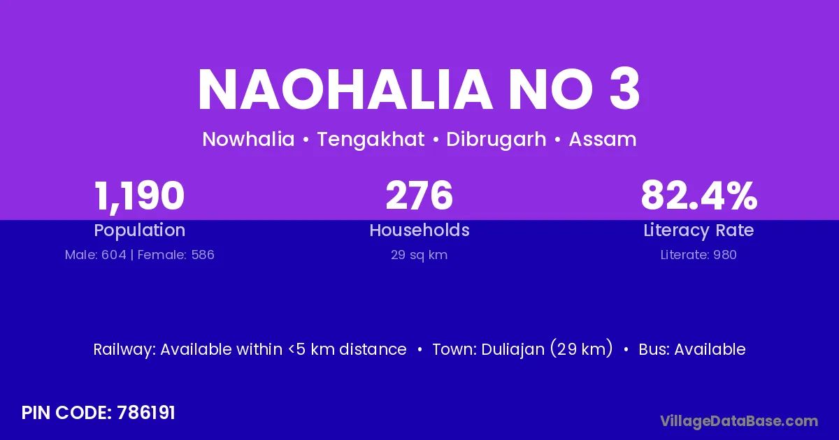 Duliajan (29 km) is the nearest town to Naohalia No 3 village for major economic activities and is located approximately 29 km away.
