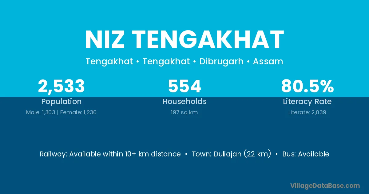 Duliajan (22 km) is the nearest town to Niz Tengakhat village for major economic activities and is located approximately 22 km away.