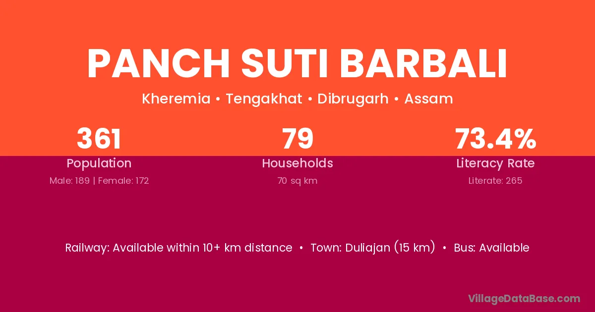 Duliajan (15 km) is the nearest town to Panch Suti Barbali village for major economic activities and is located approximately 15 km away.