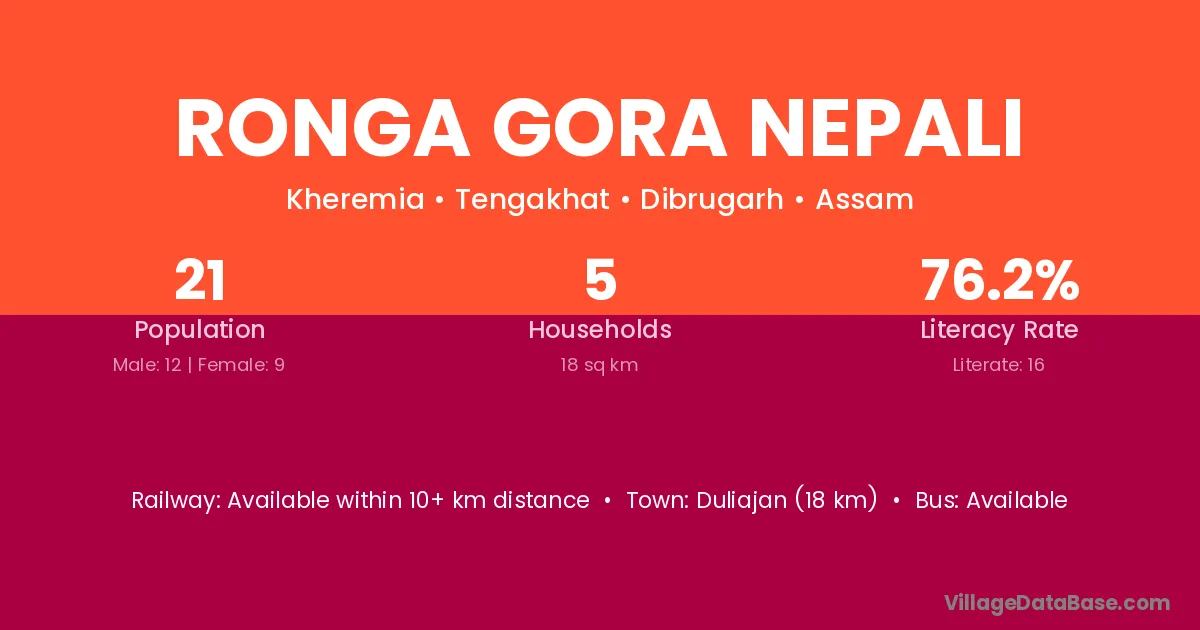 Duliajan (18 km) is the nearest town to Ronga Gora Nepali village for major economic activities and is located approximately 18 km away.