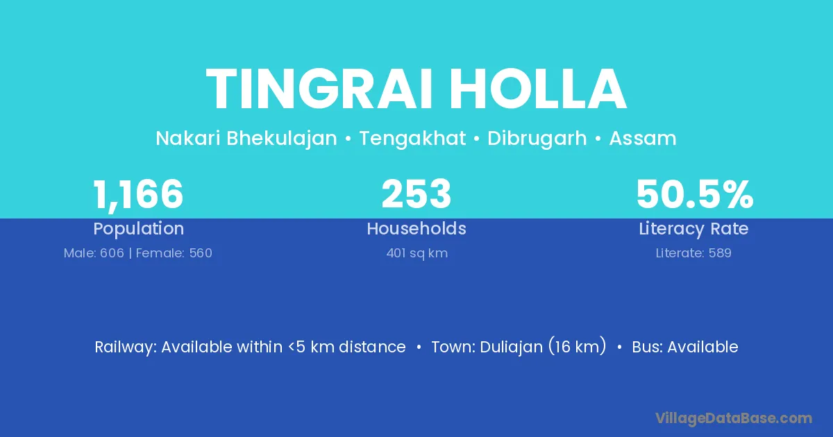 Duliajan (16 km) is the nearest town to Tingrai Holla village for major economic activities and is located approximately 16 km away.