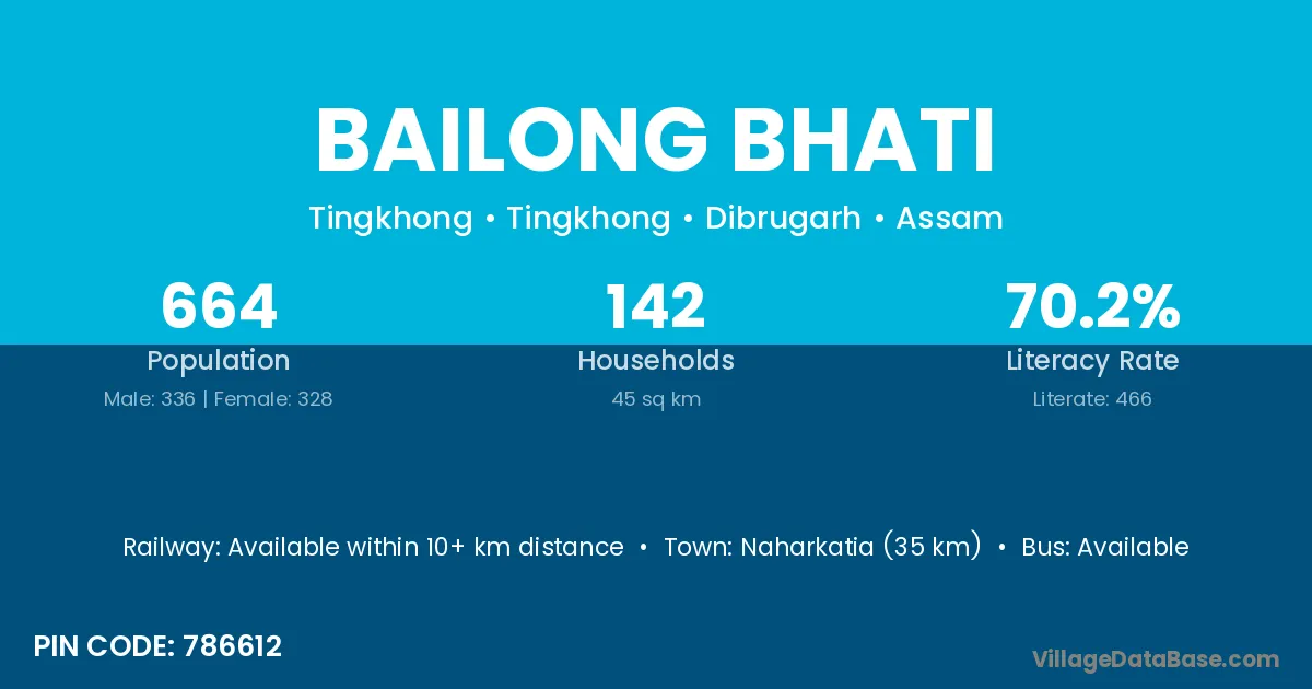 Naharkatia (35 km) is the nearest town to Bailong Bhati village for major economic activities and is located approximately 35 km away.