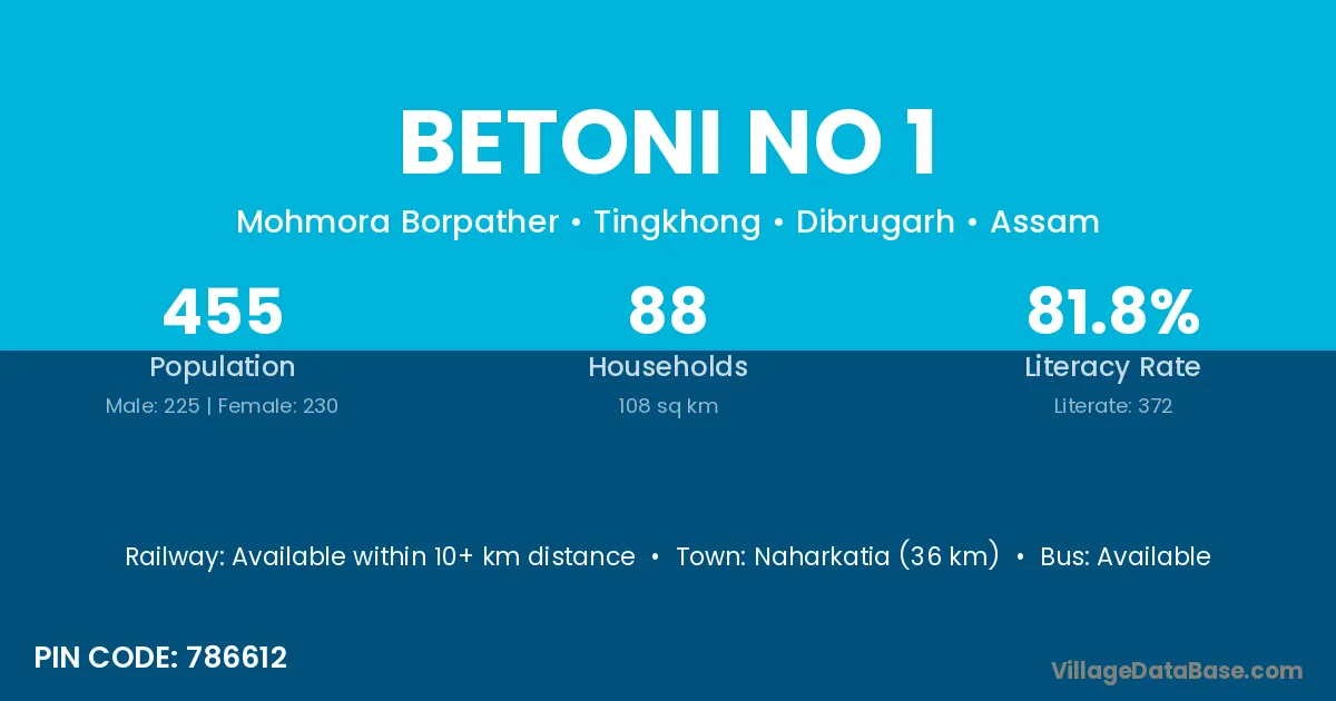 Naharkatia (36 km) is the nearest town to Betoni No 1 village for major economic activities and is located approximately 36 km away.