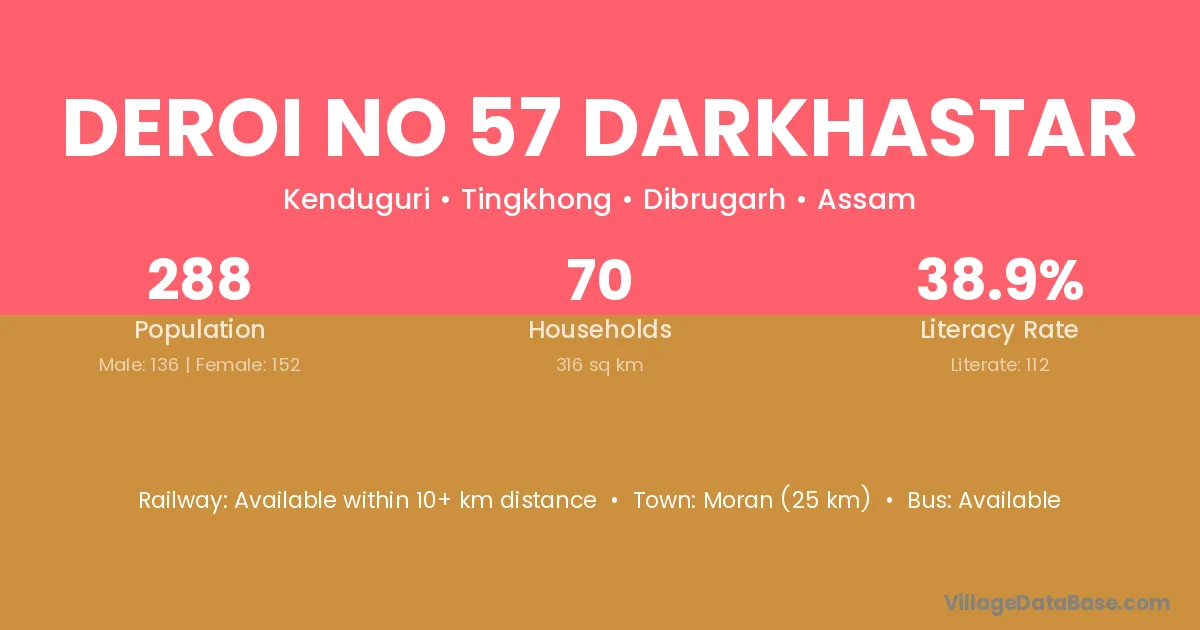 Moran (25 km) is the nearest town to Deroi No 57 Darkhastar village for major economic activities and is located approximately 25 km away.