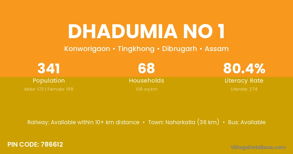 Naharkatia (36 km) is the nearest town to Dhadumia No 1 village for major economic activities and is located approximately 36 km away.