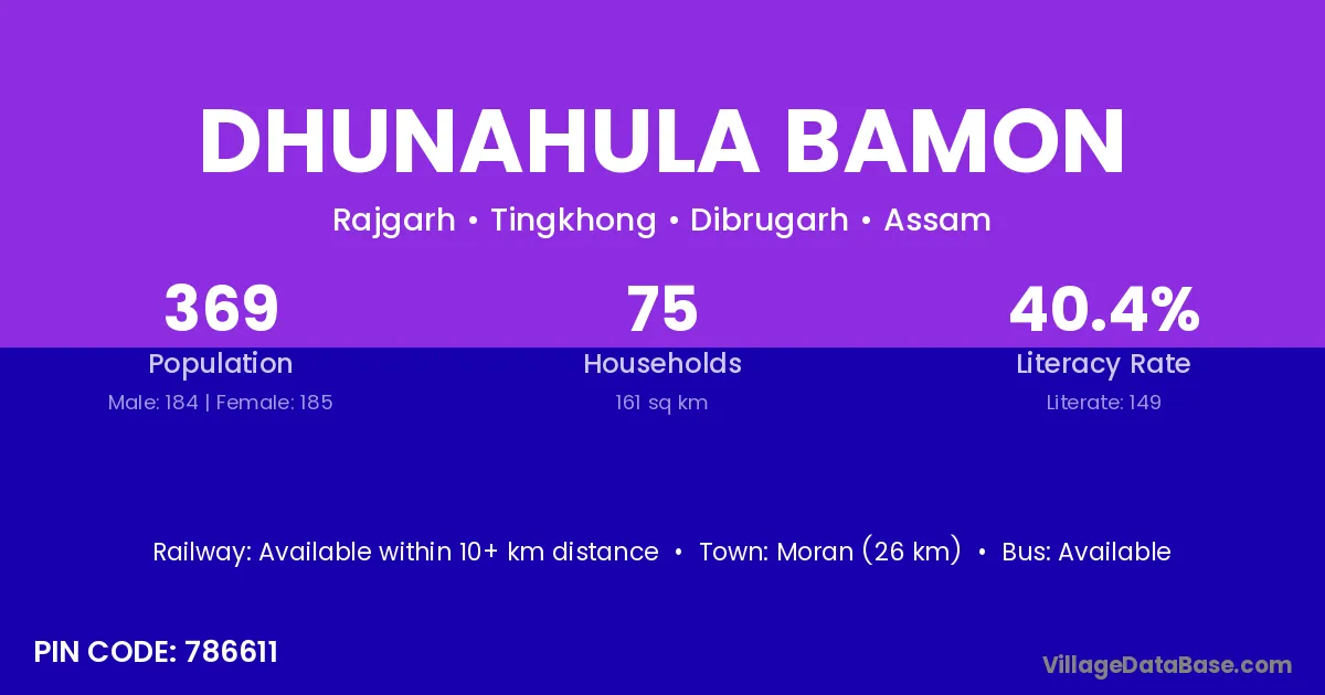 Moran (26 km) is the nearest town to Dhunahula Bamon village for major economic activities and is located approximately 26 km away.