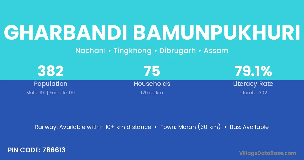 Gharbandi Bamunpukhuri village has a total population of 382 people, of which 191 are males and 191 are females.