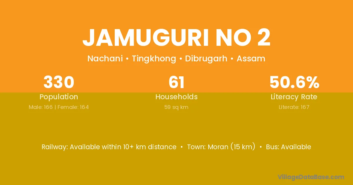 Jamuguri No 2 village has a total population of 330 people, of which 166 are males and 164 are females.