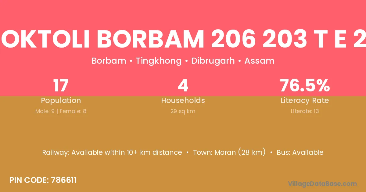 Moran (28 km) is the nearest town to Jooktoli Borbam 206 203 T E 24 1 village for major economic activities and is located approximately 28 km away.
