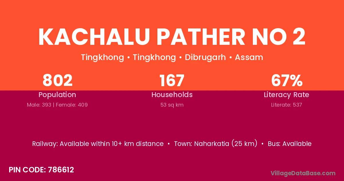 Naharkatia (25 km) is the nearest town to Kachalu Pather No 2 village for major economic activities and is located approximately 25 km away.