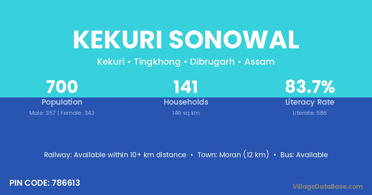 Moran (12 km) is the nearest town to Kekuri Sonowal village for major economic activities and is located approximately 12 km away.