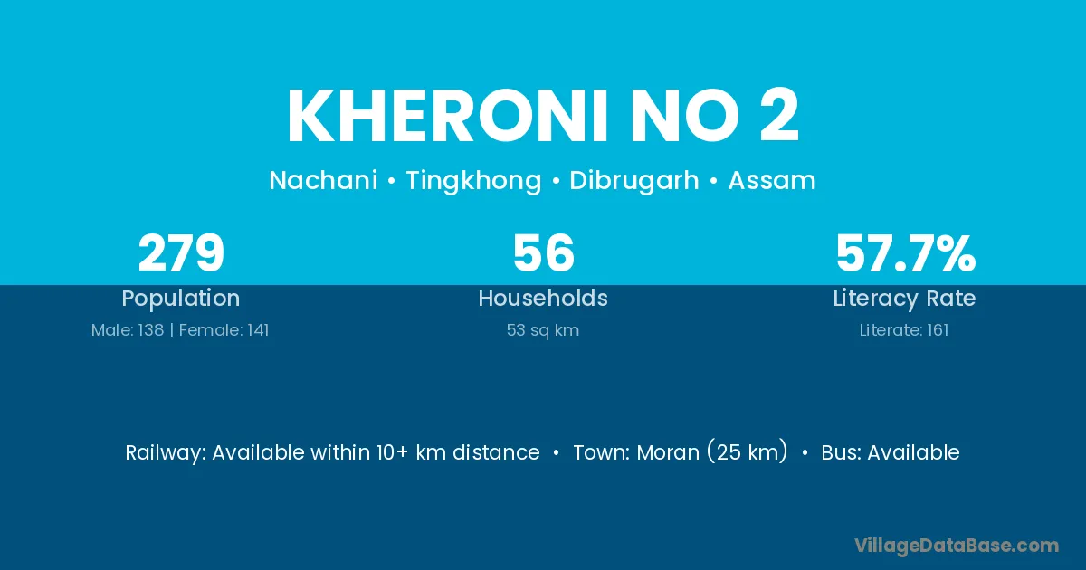 Moran (25 km) is the nearest town to Kheroni No 2 village for major economic activities and is located approximately 25 km away.