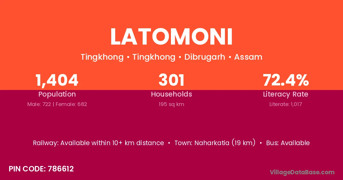 Naharkatia (19 km) is the nearest town to Latomoni village for major economic activities and is located approximately 19 km away.