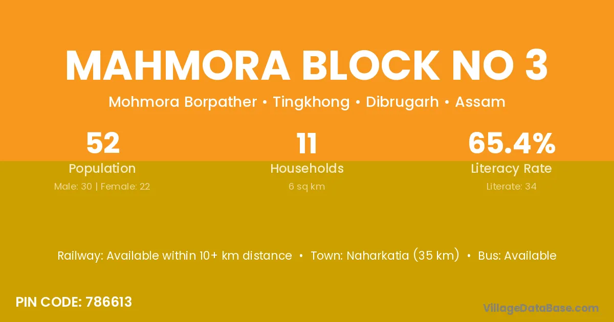 Naharkatia (35 km) is the nearest town to Mahmora Block No 3 village for major economic activities and is located approximately 35 km away.