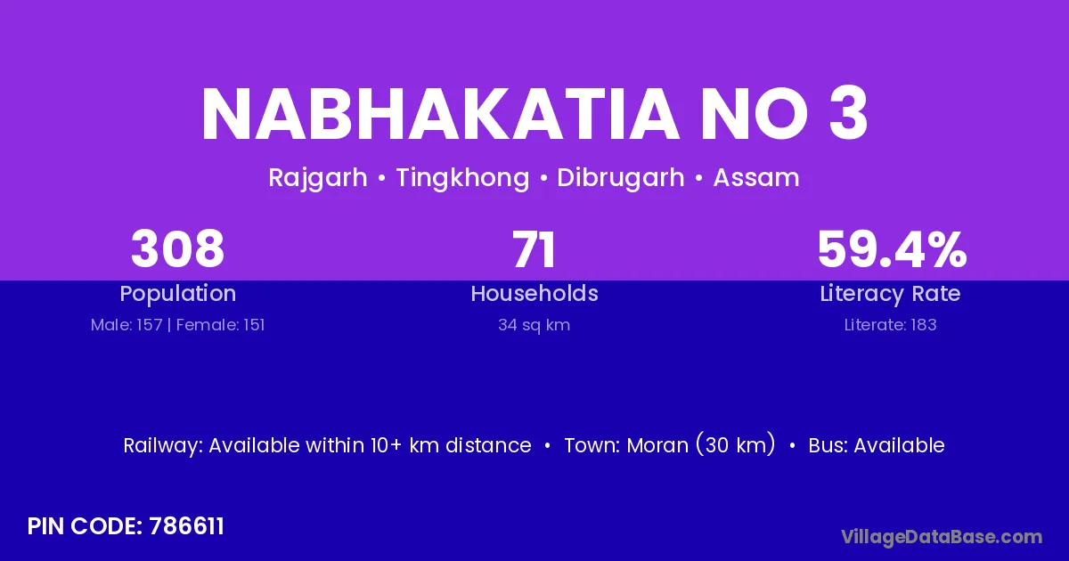 Moran (30 km) is the nearest town to Nabhakatia No 3 village for major economic activities and is located approximately 30 km away.