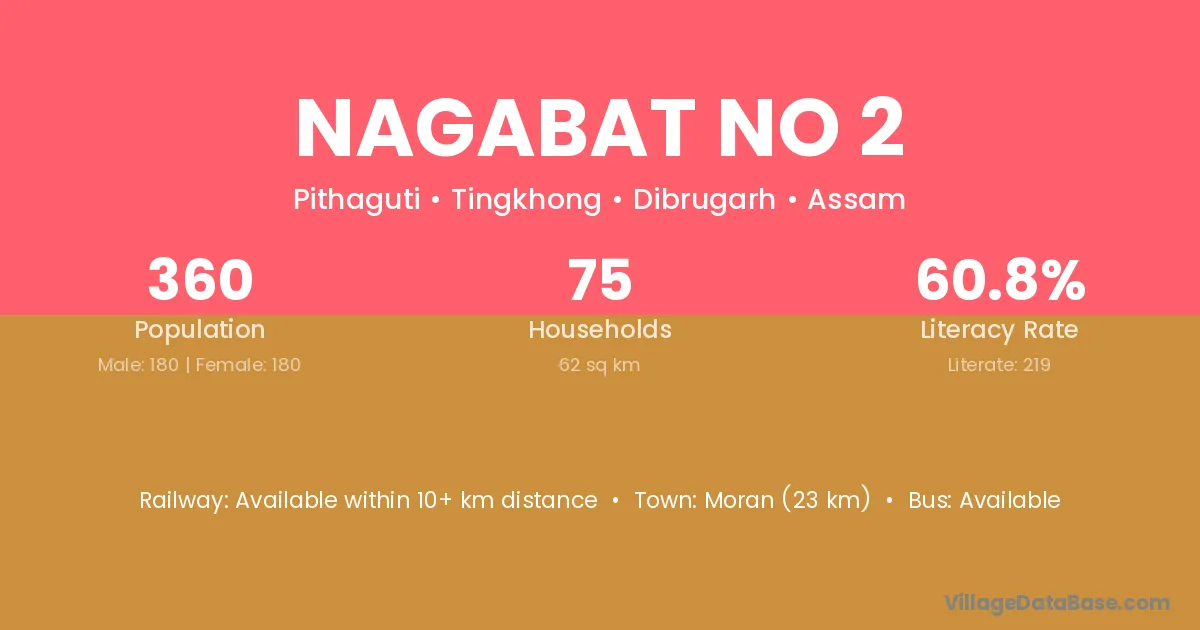 Moran (23 km) is the nearest town to Nagabat No 2 village for major economic activities and is located approximately 23 km away.