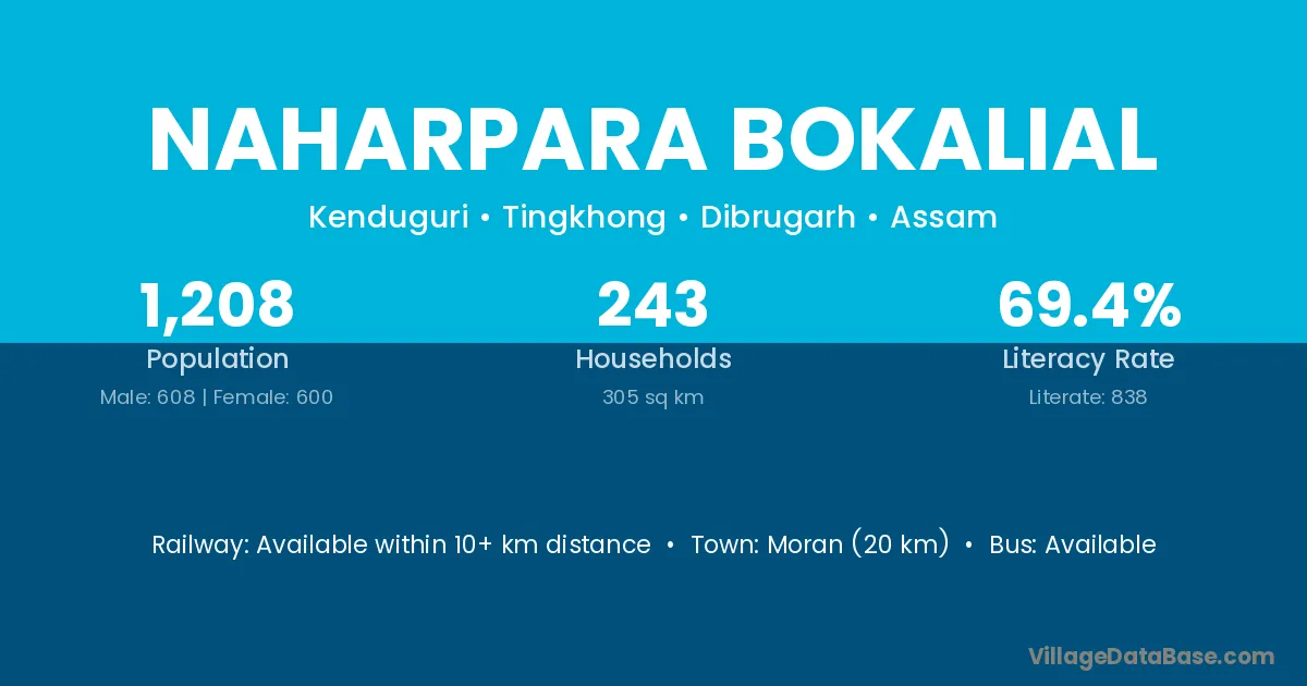 Moran (20 km) is the nearest town to Naharpara Bokalial village for major economic activities and is located approximately 20 km away.