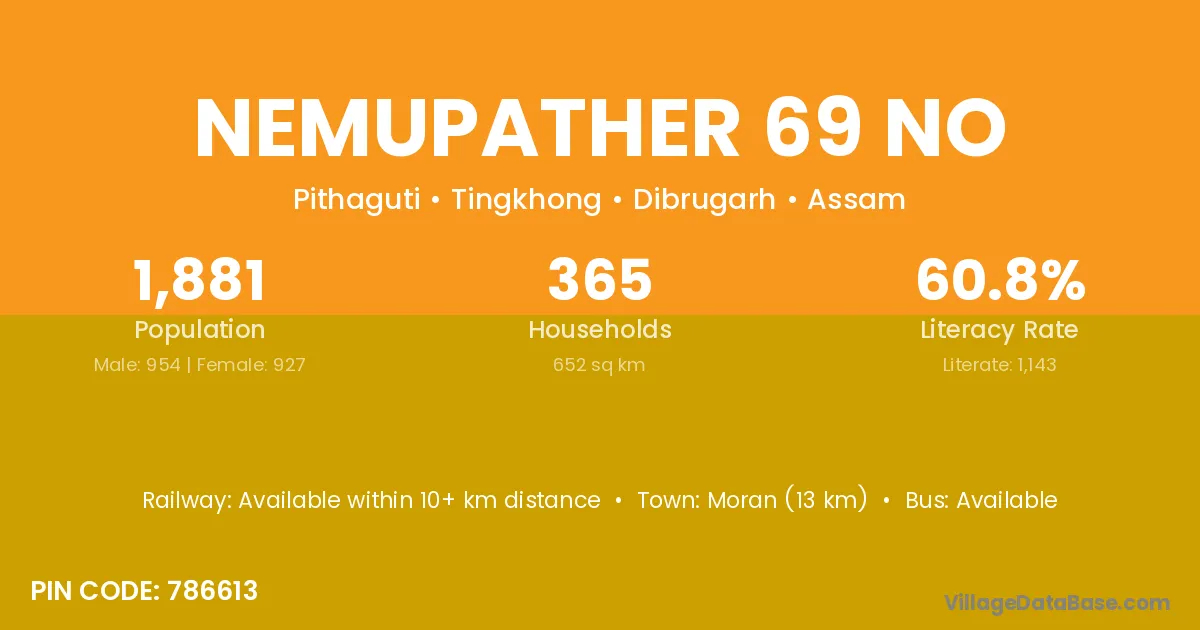 Moran (13 km) is the nearest town to Nemupather 69 No village for major economic activities and is located approximately 13 km away.