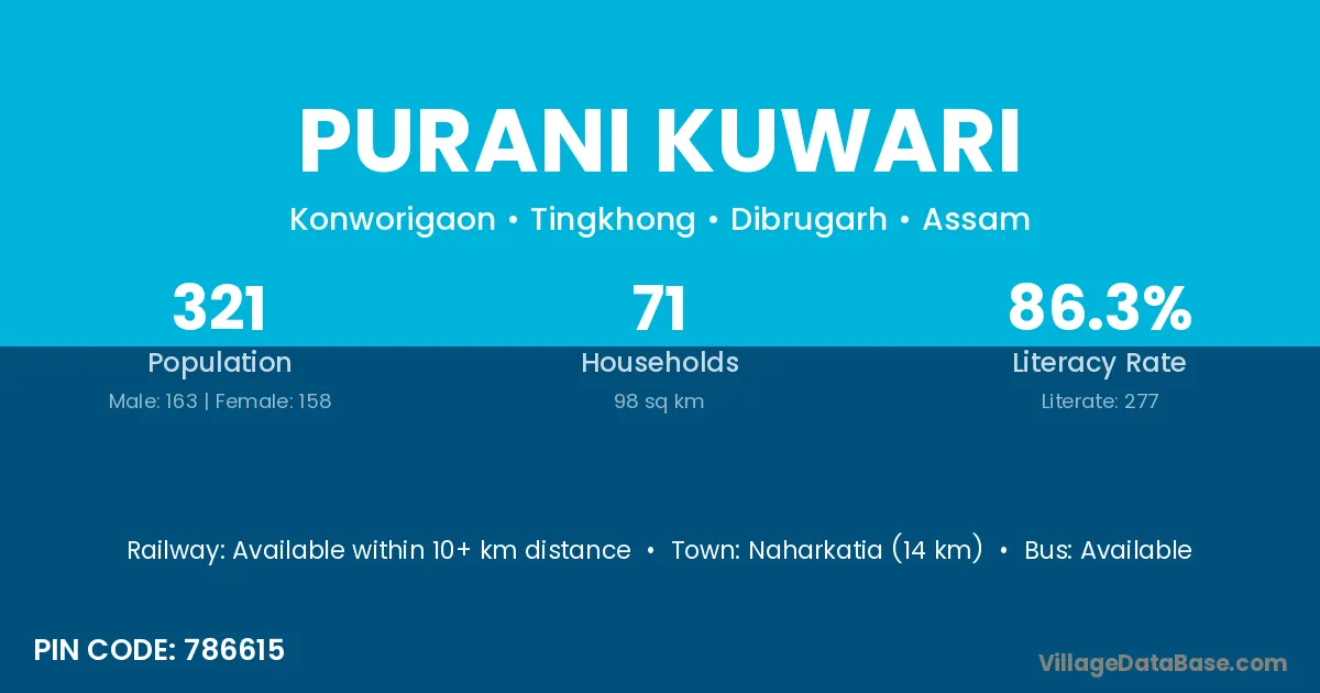 Naharkatia (14 km) is the nearest town to Purani Kuwari village for major economic activities and is located approximately 14 km away.