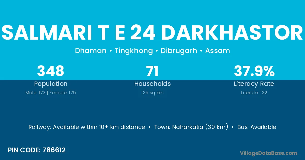 Naharkatia (30 km) is the nearest town to Salmari T E 24 Darkhastor village for major economic activities and is located approximately 30 km away.
