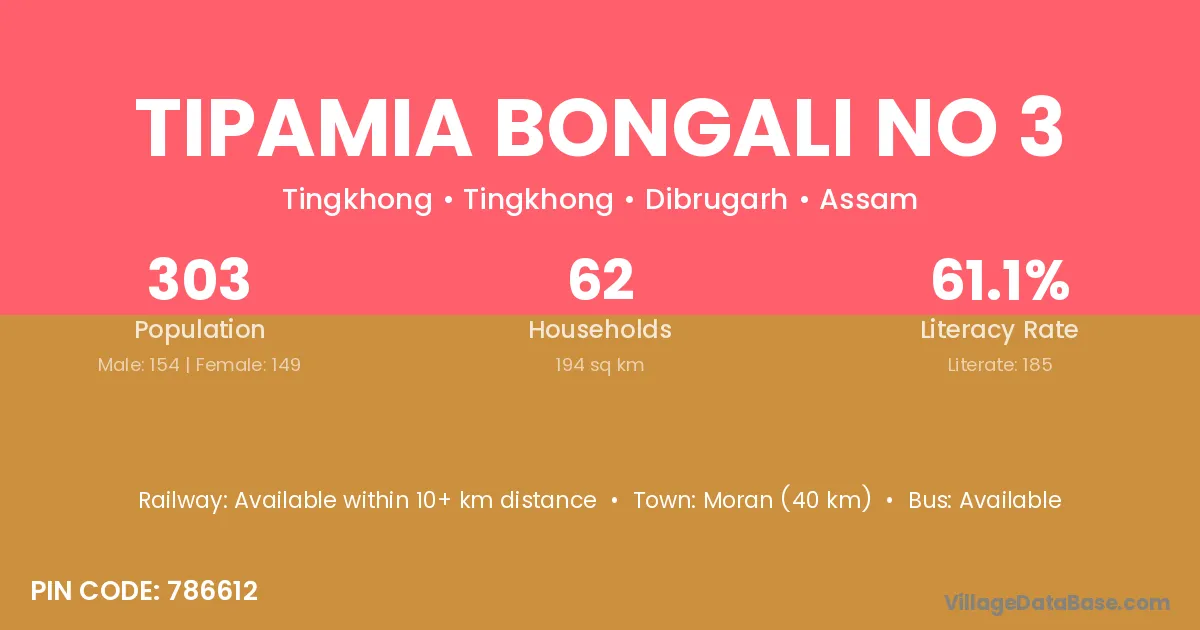 Moran (40 km) is the nearest town to Tipamia Bongali No 3 village for major economic activities and is located approximately 40 km away.