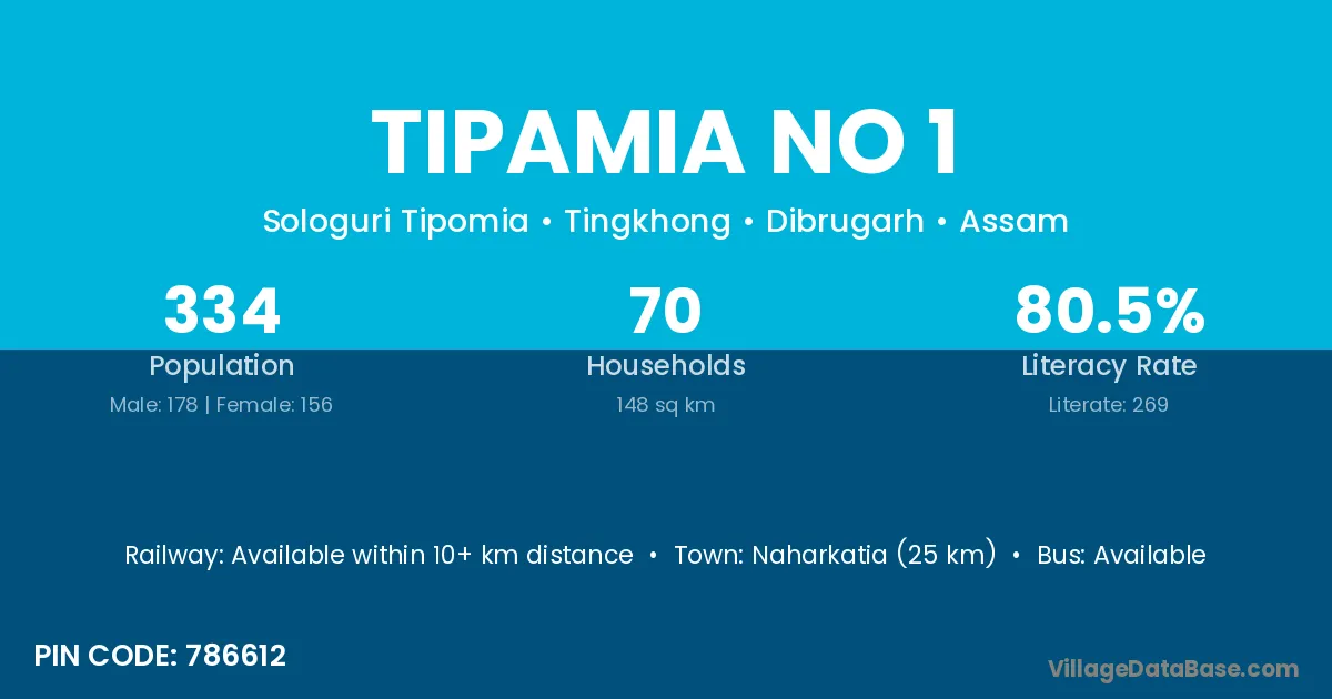 Naharkatia (25 km) is the nearest town to Tipamia No 1 village for major economic activities and is located approximately 25 km away.