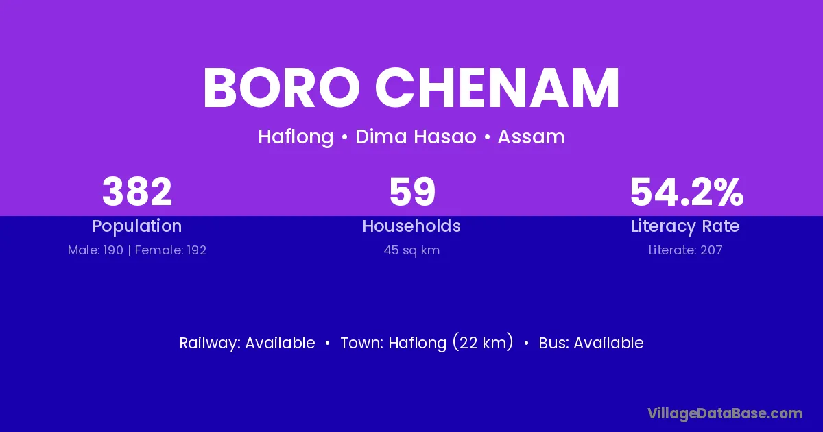 Haflong (22 km) is the nearest town to Boro Chenam village for major economic activities and is located approximately 22 km away.
