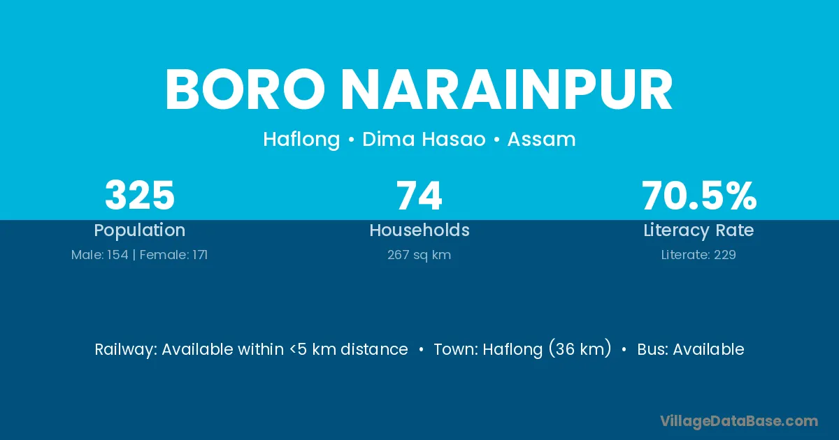 Haflong (36 km) is the nearest town to Boro Narainpur village for major economic activities and is located approximately 36 km away.