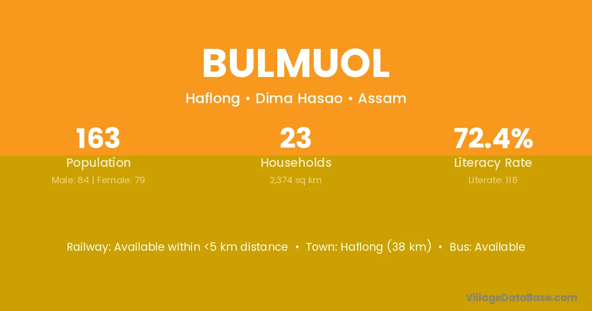 Haflong (38 km) is the nearest town to Bulmuol village for major economic activities and is located approximately 38 km away.