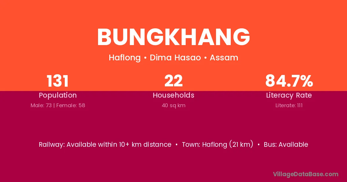 Haflong (21 km) is the nearest town to Bungkhang village for major economic activities and is located approximately 21 km away.