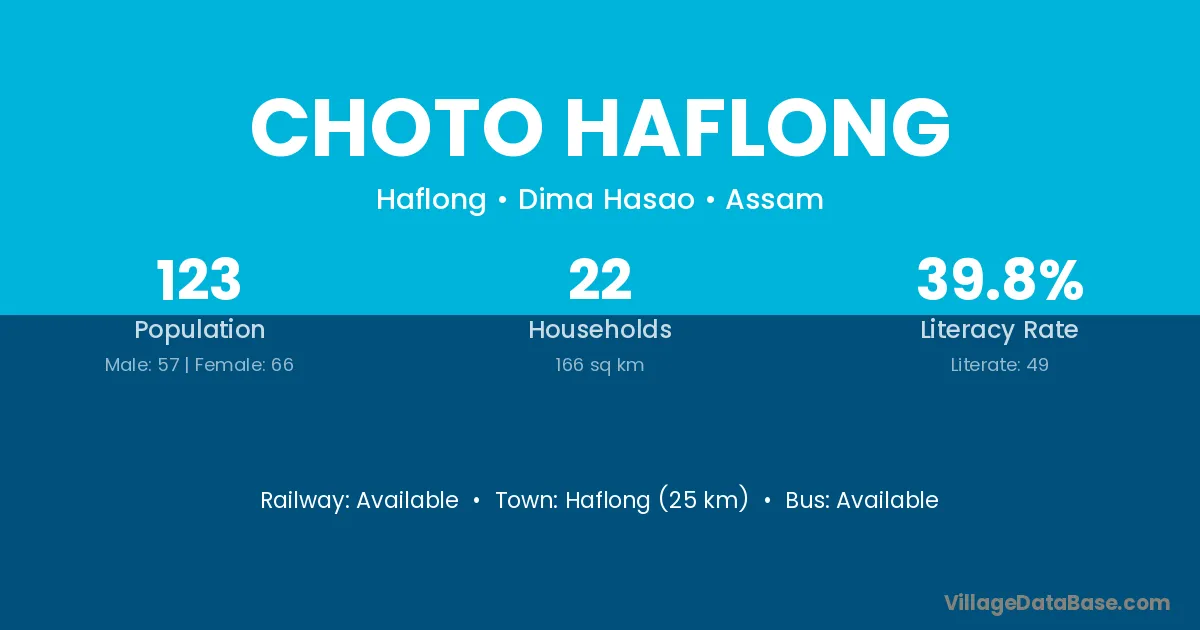 Choto Haflong village has a total population of 123 people, of which 57 are males and 66 are females.