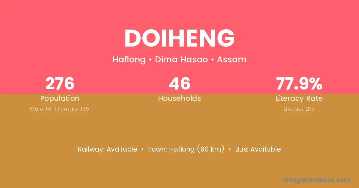 Haflong (60 km) is the nearest town to Doiheng village for major economic activities and is located approximately 60 km away.