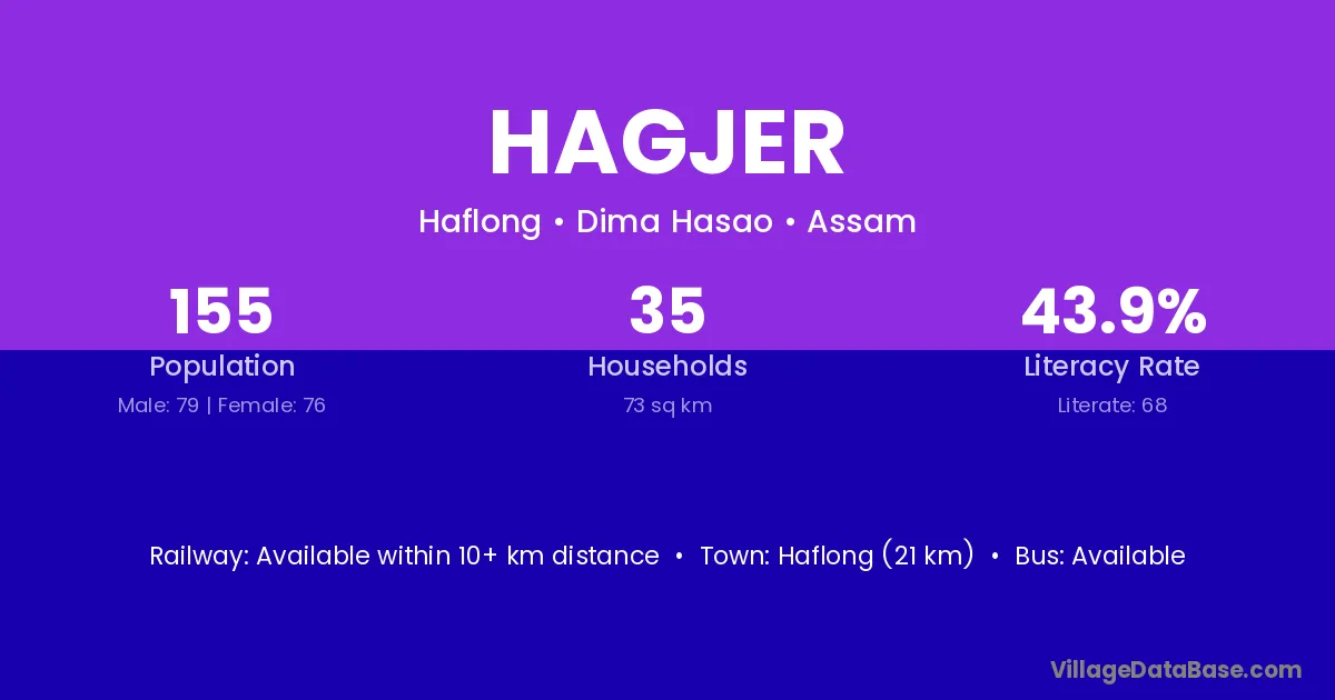 Haflong (21 km) is the nearest town to Hagjer village for major economic activities and is located approximately 21 km away.